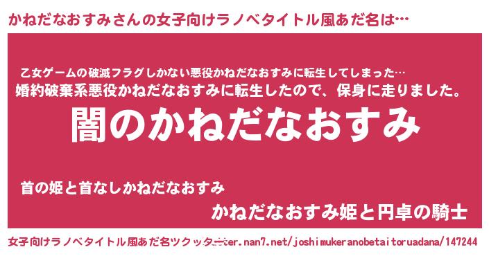 | 男性向けラノベタイトル風あだ名 | 『Re:かねだなおすみから始める異世界生活』 |