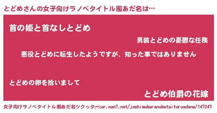 | 男性向けラノベタイトル風あだ名 | 『この素晴らしい世界にとどめを!』 |