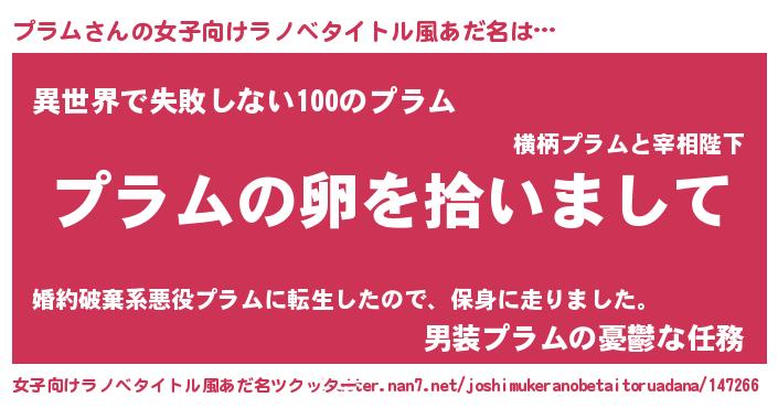 | 男性向けラノベタイトル風あだ名 | 『プラムの嫁は女の子じゃないと思った?』 |