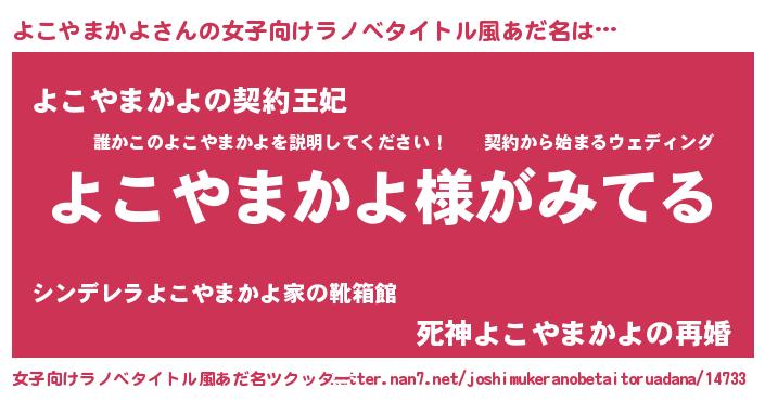 | 男性向けラノベタイトル風あだ名 | 『よこやまかよの嫁は女の子じゃないと思った?』 |