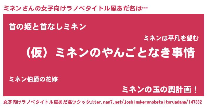 | 男性向けラノベタイトル風あだ名 | 『ミネンの憂鬱』『はたらくミネンさま!』 |