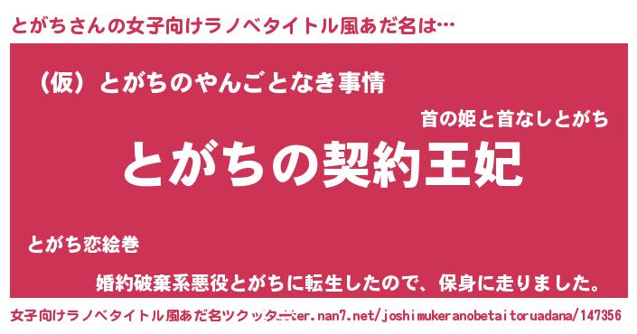 | 男性向けラノベタイトル風あだ名 | 『とがちという概念が存在しない退屈な世界 』 |