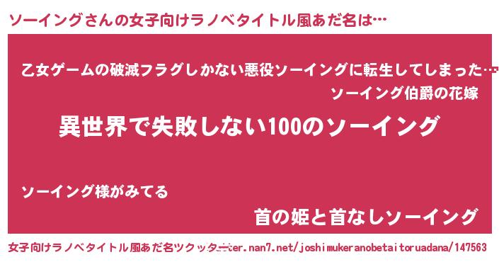 | 男性向けラノベタイトル風あだ名 | 『ソーイングという概念が存在しない退屈な世界 』 |