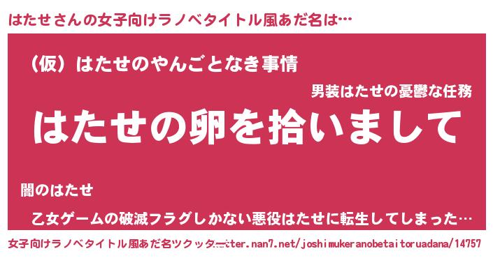 | 意味不明あだ名 | 『とにかく怪しいはたせ』『自称はたせ』 |