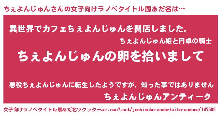 | 男性向けラノベタイトル風あだ名 | 『ちぇよんじゅんの嫁は女の子じゃないと思った?』 |
