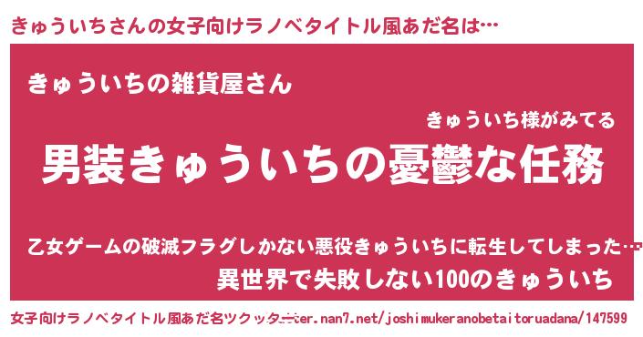 | 胡散臭い通販商品みたいなあだ名 | 『運命の人と巡り会える高級そうな絵画…その名も「きゅういち」』 |