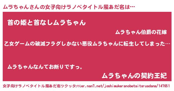 | 男性向けラノベタイトル風あだ名 | 『この素晴らしい世界にムラちゃんを!』 |