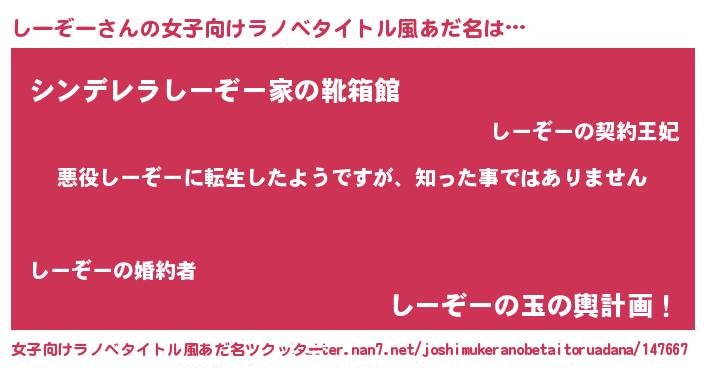 | 男性向けラノベタイトル風あだ名 | 『この素晴らしい世界にしーぞーを!』 |