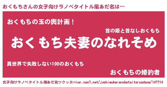 | 男性向けラノベタイトル風あだ名 | 『おまえをオタクにしてやるから、俺をおくもちにしてくれ! 』 |