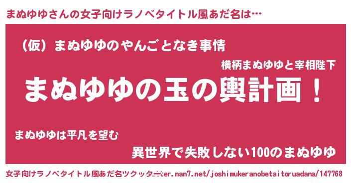 まぬゆゆさんの女子向けラノベタイトル風あだ名は… 『まぬゆゆの玉の輿計画!』『(仮)まぬゆゆのやんごとなき事情』『異世界で失敗しない100のまぬゆゆ』 ツクッター #女子向けラノベタイトル風あだ名ツクッター http://tkutter.nan7.net/joshimukeranobetaitoruadana/147768/