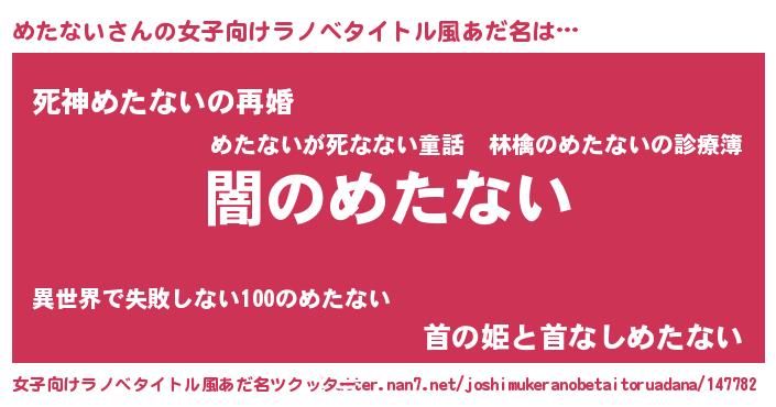 | 男性向けラノベタイトル風あだ名 | 『Re:めたないから始める異世界生活』 |