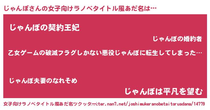 男性向けラノベタイトル風あだ名 | 『魔弾の王とじゃんぼ』 |