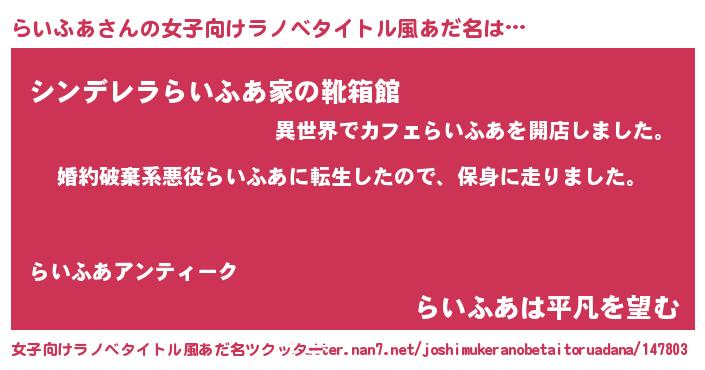 | 胡散臭い通販商品みたいなあだ名 | 『信頼と実績のサプリメント…その名も「らいふあ」』 |