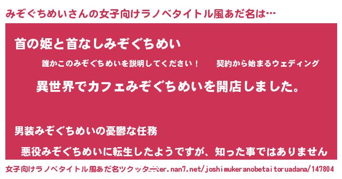| 男性向けラノベタイトル風あだ名 | 『誰もが恐れるあのみぞぐちめいが、ぼくの専属メイドになるようです。』 |
