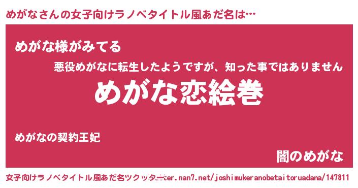 | 男性向けラノベタイトル風あだ名 | 『おまえをオタクにしてやるから、俺をめがなにしてくれ! 』 |