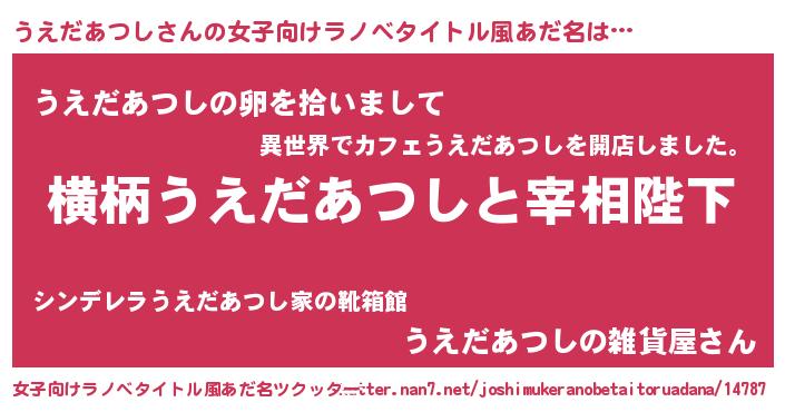 | 男性向けラノベタイトル風あだ名 | 『うえだあつしに滅ぼされるだけの簡単なお仕事です』 |