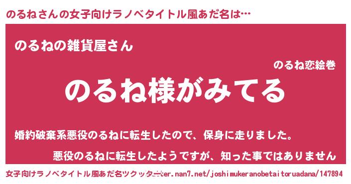| 男性向けラノベタイトル風あだ名 | 『のるねの嫁は女の子じゃないと思った?』 |