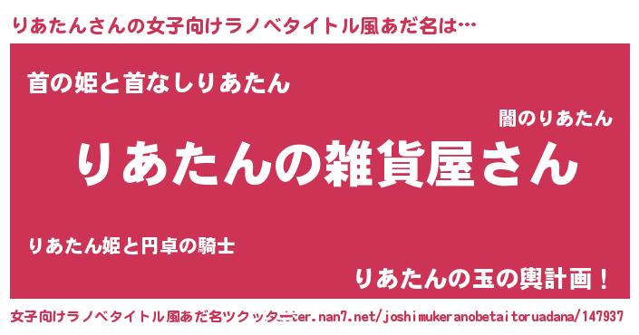 りあたんさんの女子向けラノベタイトル風あだ名は… 『りあたんの雑貨屋さん』『首の姫と首なしりあたん』『りあたんの玉の輿計画!』 ツクッター #女子向けラノベタイトル風あだ名ツクッター http://tkutter.nan7.net/joshimukeranobetaitoruadana/147937/