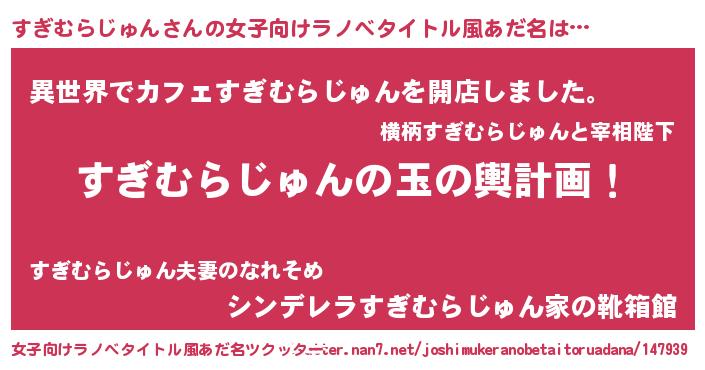| 男性向けラノベタイトル風あだ名 | 『すぎむらじゅん~年齢イコール彼女いない歴の魔法使い~』 |