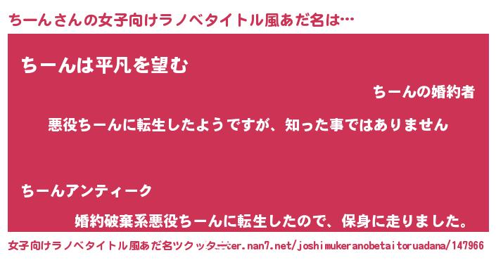 | 男性向けラノベタイトル風あだ名 | 『この素晴らしい世界にちーんを!』 |