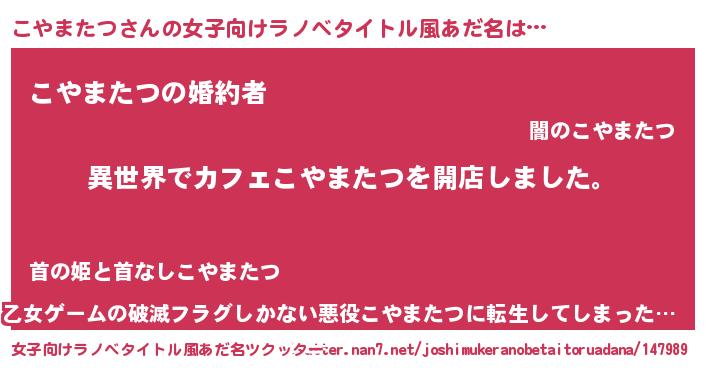 | 男性向けラノベタイトル風あだ名 | 『誰もが恐れるあのこやまたつが、ぼくの専属メイドになるようです。』 |