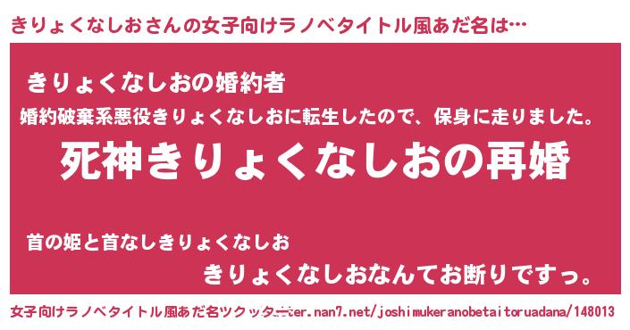 | 男性向けラノベタイトル風あだ名 | 『ノーゲーム・ノーキリョクナシオ』 |