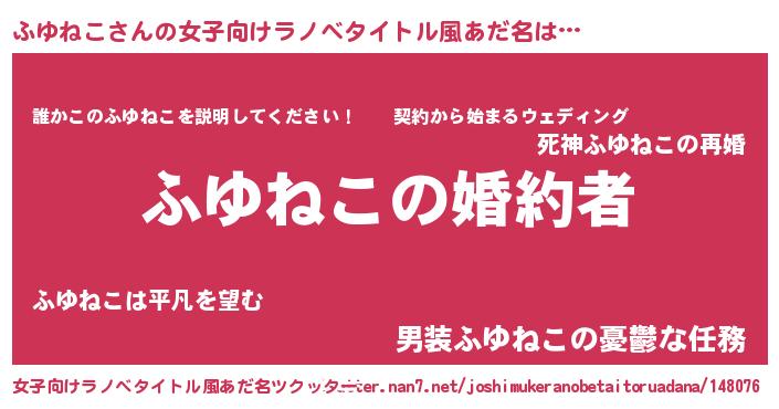 ふゆねこさんの女子向けラノベタイトル風あだ名は… 『ふゆねこの婚約者』『誰かこのふゆねこを説明してください! ~契約から始まるウェディング~』『男装ふゆねこの憂鬱な任務』 ツクッター #女子向けラノベタイトル風あだ名ツクッター http://tkutter.nan7.net/joshimukeranobetaitoruadana/148076/