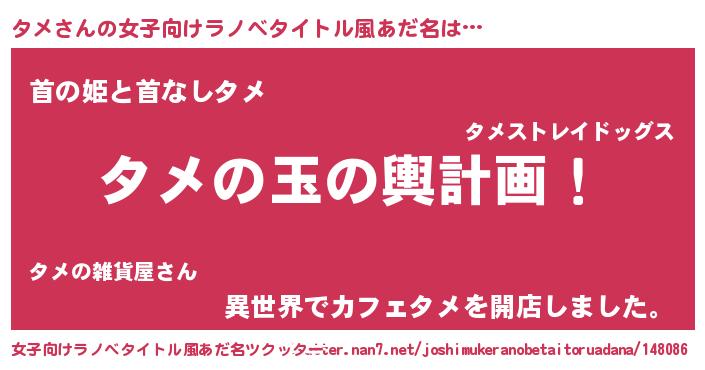 | 男性向けラノベタイトル風あだ名 | 『タメ~年齢イコール彼女いない歴の魔法使い~』 |