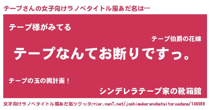 テープさんの女子向けラノベタイトル風あだ名は… 『テープなんてお断りですっ。』『テープ様がみてる』『シンデレラテープ家の靴箱館』 ツクッター #女子向けラノベタイトル風あだ名ツクッター http://tkutter.nan7.net/joshimukeranobetaitoruadana/148089/