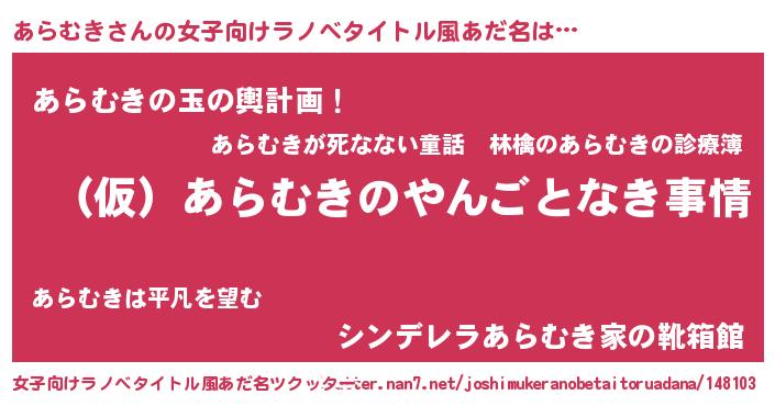 あらむきさんの女子向けラノベタイトル風あだ名は… 『(仮)あらむきのやんごとなき事情』『あらむきの玉の輿計画!』『シンデレラあらむき家の靴箱館』 ツクッター #女子向けラノベタイトル風あだ名ツクッター http://tkutter.nan7.net/joshimukeranobetaitoruadana/148103/