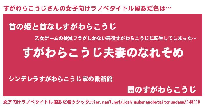 すがわらこうじさんの女子向けラノベタイトル風あだ名は… 『すがわらこうじ夫妻のなれそめ』『首の姫と首なしすがわらこうじ』『闇のすがわらこうじ』 ツクッター #女子向けラノベタイトル風あだ名ツクッター http://tkutter.nan7.net/joshimukeranobetaitoruadana/148110/