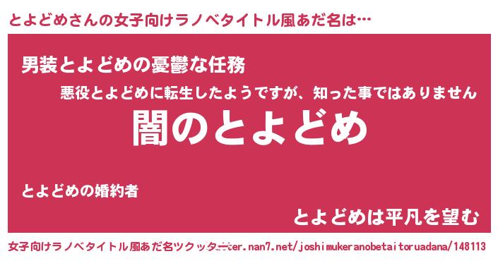 | 男性向けラノベタイトル風あだ名 | 『Re:とよどめから始める異世界生活』 |