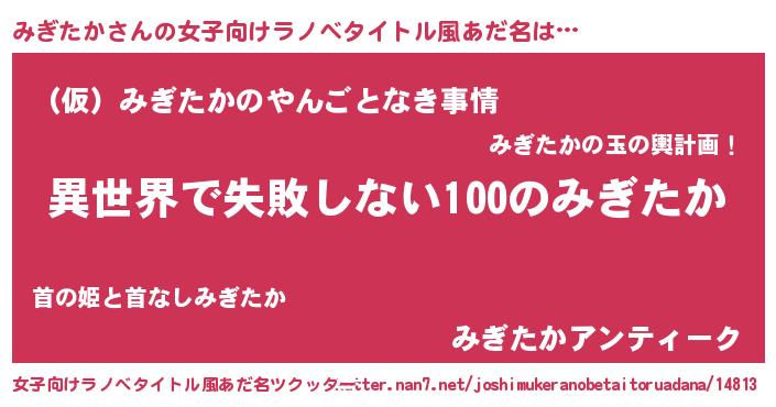 | 胡散臭い通販商品みたいなあだ名 | 『絶対に幸福をもたらす水素水…その名も「みぎたか」』 |