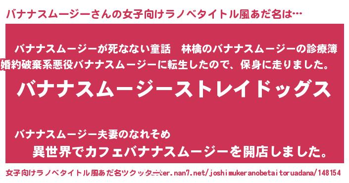 バナナスムージーさんの女子向けラノベタイトル風あだ名は… 『バナナスムージーストレイドッグス』『バナナスムージーが死なない童話 林檎のバナナスムージーの診療簿』『異世界でカフェバナナスムージーを開店しました。』 ツクッター #女子向けラノベタイトル風あだ名ツクッター http://tkutter.nan7.net/joshimukeranobetaitoruadana/148154/