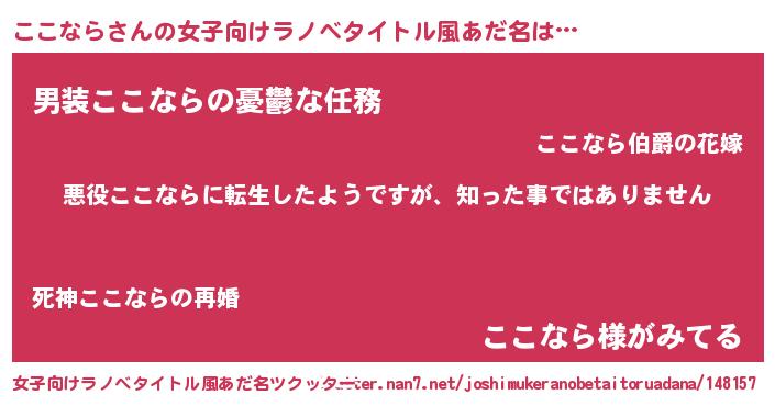 ここならさんの女子向けラノベタイトル風あだ名は… 『悪役ここならに転生したようですが、知った事ではありません』『男装ここならの憂鬱な任務』『ここなら様がみてる』 ツクッター #女子向けラノベタイトル風あだ名ツクッター http://tkutter.nan7.net/joshimukeranobetaitoruadana/148157/