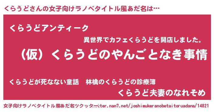 | 男性向けラノベタイトル風あだ名 | 『くらうどの憂鬱』『魔弾の王とくらうど』 |