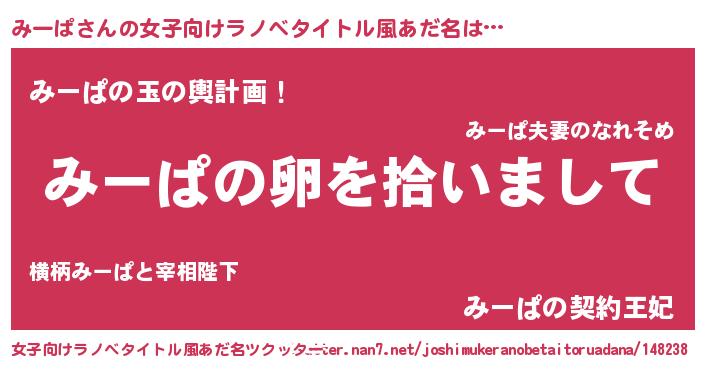 | 男性向けラノベタイトル風あだ名 | 『ダンジョンにみーぱを求めるのは間違っているだろうか』 |