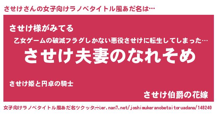 | 男性向けラノベタイトル風あだ名 | 『おまえをオタクにしてやるから、俺をさせけにしてくれ! 』 |