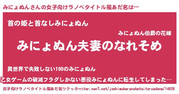 | 男性向けラノベタイトル風あだ名 | 『おまえをオタクにしてやるから、俺をみにょぬんにしてくれ! 』 |