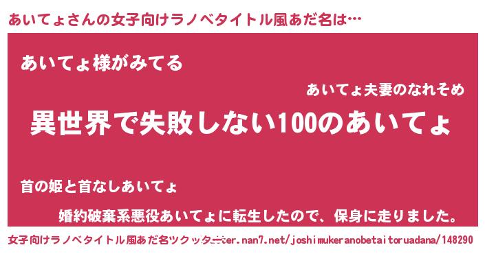 | 男性向けラノベタイトル風あだ名 | 『あいてょという概念が存在しない退屈な世界 』 |