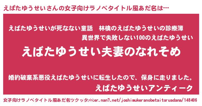 | 男性向けラノベタイトル風あだ名 | 『おまえをオタクにしてやるから、俺をえばたゆうせいにしてくれ! 』 |