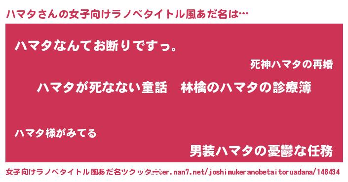 | 男性向けラノベタイトル風あだ名 | 『魔弾の王とハマタ』 |