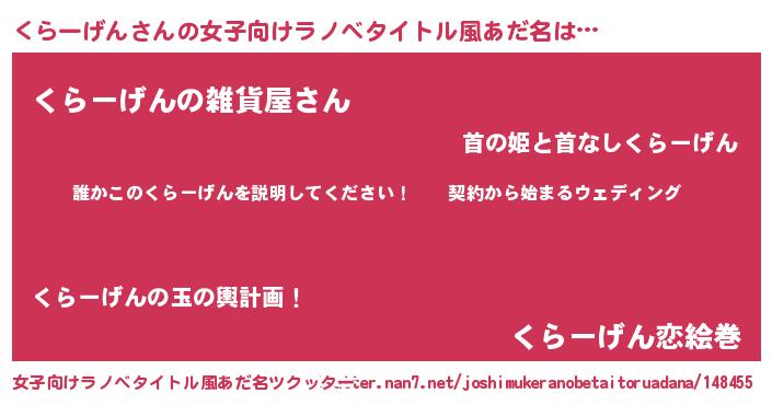 くらーげんさんの女子向けラノベタイトル風あだ名は… 『誰かこのくらーげんを説明してください! ~契約から始まるウェディング~』『くらーげんの雑貨屋さん』『くらーげん恋絵巻』 ツクッター #女子向けラノベタイトル風あだ名ツクッター http://tkutter.nan7.net/joshimukeranobetaitoruadana/148455/