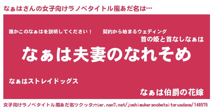 | 男性向けラノベタイトル風あだ名 | 『おまえをオタクにしてやるから、俺をなぁはにしてくれ! 』 |