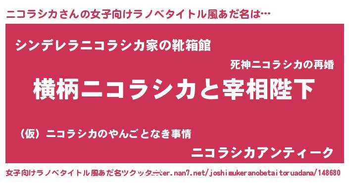 | 男性向けラノベタイトル風あだ名 | 『ニコラシカに滅ぼされるだけの簡単なお仕事です』 |