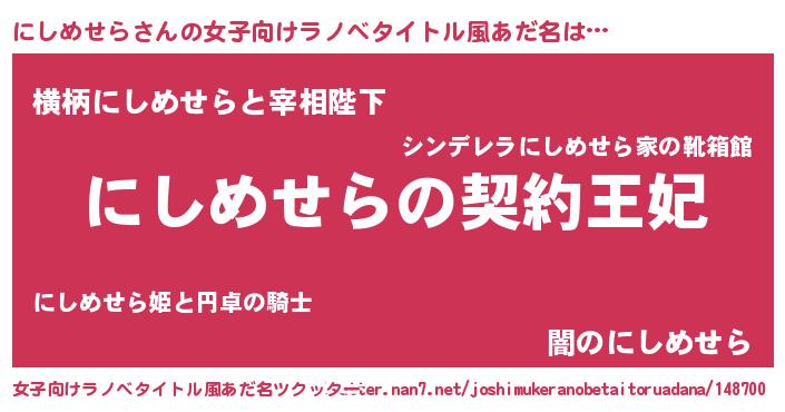 | 男性向けラノベタイトル風あだ名 | 『誰もが恐れるあのにしめせらが、ぼくの専属メイドになるようです。』 |