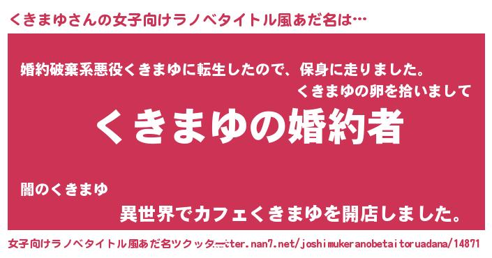| 男性向けラノベタイトル風あだ名 | 『うちの娘の為ならば、俺はもしかしたらくきまゆも倒せるかもしれない。』 |