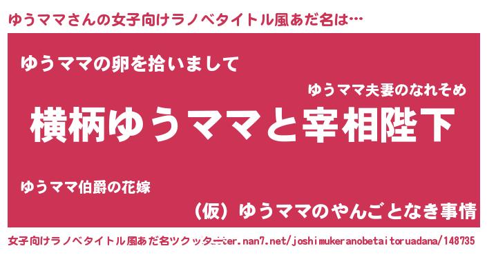 | 男性向けラノベタイトル風あだ名 | 『ゆうママに滅ぼされるだけの簡単なお仕事です』 |