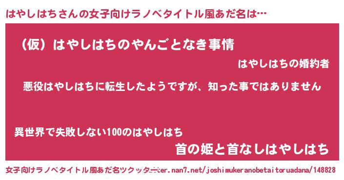 | 男性向けラノベタイトル風あだ名 | 『この素晴らしい世界にはやしはちを!』 |