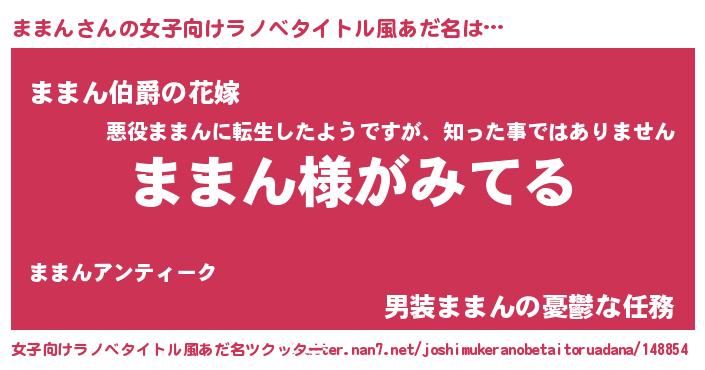 | 男性向けラノベタイトル風あだ名 | 『ままんの嫁は女の子じゃないと思った?』 |